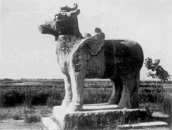 宋陵石雕继承唐代遗风,并逐渐转向精细刻划(图三八)。立狮造型在唐代只偶尔一见,而宋代则为必设之石兽。唐代翼马已为象和角端所代替,驼鸟为瑞禽石屏所代替。各种动物雕刻精细,形象优美,艺术手法以写实为主。而在写实中又注意夸张取舍,以求静中有动,寓动于静,神形兼备的艺术效果。明清两代陵墓石雕继承宋代成就,更进一步趋向装饰性雕饰。其间明孝陵、十三陵石兽雕刻中也不失为优秀的作品,但气魄已不如前朝,陵墓石雕艺术亦走向尾声(图三九~四○)。