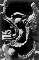 帝王陵前多为麒麟,并麒麟中双角者为『天禄』。」又《汉书·西域传》:「瑞兽符拔,似鹿,长尾,一角者为天鹿(天禄),双角者为辟邪。」南朝帝王陵前有麒麟、天禄、辟邪等,唐代帝陵前多为天禄。〔角端〕《宋书、符端志》下篇:角端者,日行万八千里,又晓四夷之语,明君圣主在位,明达方外幽远之事,则奉书而至。形象为狮身。独角、长尾、四爪、上唇特长(有的前伸,有的上卷),宋陵石雕有此形象。有的古籍称为「端端」,形象既不类狮,又不像虎,而为类似犀牛的有翼神兽(图六七)。〔天马〕本为汉代对西域良马的称呼,后即有带翼之马形(图六八)作品。
