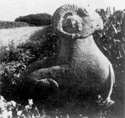 图六九   「祥」即由「羊」之转化而成,帝王陵前多有置神羊。广州市别名羊城,传说周夷王时,有五个仙人骑着口衔禾穗的五只羊降落楚庭(广州别名),把禾穗赠给州人,祝州人永无饥荒,仙人即隐去,羊化为五石。后在广州五仙观,曾塑有五仙五羊像,作谷神奉祀(图七○)。此外还有其它许多瑞兽,如佛教艺术中的白象、鹿、九尾狐,民间神话中的玉兔;吉祥图案中的蝙蝠、仙鹤及十二生肖瑞兽等等(图七一,七二,七三,七四,七五)。