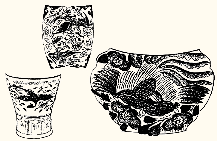 图三四图三五图三六 图三七图三八 元代瓷器装饰成熟,凤纹的种种表现都富有艺术性,有些形象随手画来,浓淡得宜,明快流畅。 到了明清时期,凤纹装饰已经成为一种特定的造形,无论在圆形、方形或各种各样的装饰形体内,纹样构成都各具其内在形式,而凤纹的共性形态,也进一步规范化。其中,如明清的「团凤」图案,最是独具一格的饰模式,它与织物上的「团花」。器物上的「开圆」相配适,表现出特有的装饰风格。当年南京织造云锦的老艺人,在长期的实践设计中,总结出一套画凤口诀:「凤有三长,眼长、腿长、尾长。」,并要「首如锦鸡,头如藤云,翅如仙鹤」。这代表了明清工艺美术品上凤鸟纹样的成熟的装饰特征(插图三九)明清装饰艺术的最富有生气的作品,就是大量的民间工艺品。民间的蓝印花布、刺绣、挑花;民间木雕、石雕、砖雕和民间剪纸等作品中,形式感更加强烈,手法也更为丰富多样(插图四○、四一、四二、四三、四四、四五、四六、四七) 图三九图四○图四一 随着时代的发展,凤鸟纹样在中国这块古老的土地上已经历了数千年的演变,今天仍在不断创造着新的形式。观诸崭新的凤鸟纹样,不仅富有鲜明的时代气息,同时也牢牢地保持着中华民族传统的审美情趣,这是令人欣慰和鼓舞的。新的凤纹必将焕发出更美丽的光彩,为中国传统艺术发扬光大而作出贡献。 图四二图四三图四四