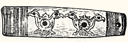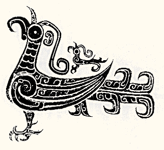 图一三 它们相对朝着一个光圈形,仰首扬尾,神采奕奕。画中双凤欣喜悦的向往和追求的神情,可说是我国原始先民们对美好愿望的表现和写照。「凤凰鸣矣,于彼高岗;梧桐生矣,于彼朝阳。」古代诗经所表达的情意与之相呼应,恐怕不是偶然的。在民间流传至今日的「丹凤朝阳」图案,正与此诗寓意相通。如前所述,商周时期,凤凰被看作是一种神鸟。故在奴隶主使用的玉器和青铜器上,凤纹的刻划,突出地表现统治者的「天命」观念。这时的凤纹几乎都作花冠状,丰满的翅膀和长长的尾羽,宽大有力的爪,显示出一派勇武健硕的情态。如殷墟出土的玉凤(插图一四、一五、一六),青铜器父丁卣腹部和父乙觥腹部的凤纹(插图一七、一八、一九)其式样都具有代表性。当时甲骨文和金文中的凤字, 图一四图一五图一六 图一七图一八图一九也完全表现出这样一种特征(插图二十),这时的凤纹完全是鸟类的神秘化和艺术的夸张。其中,最富有神话气氛的形象是安阳妇好墓出土的「人凤合体」玉饰(插图二一)纹样造形与其他玉凤相似,但凤头改作人头,头上置高冠,圆眼,菱形眼框,又有耳,凤体双钩冠羽纹和云纹。还有一类「龙凤合体」的玉饰(插图二二、二三)作蘑菇形羽冠,双圈圆眼,长翅举翘,足分三爪,凤体是双钩阴线翅羽纹,勾云纹。在凤背驮着一只卷状长尾 图二一图二二图二三的龙。龙有蘑菇形角,并刻眼目纹、重环纹、斜方格纹等。它们都典型地概括了这一时期凤纹的形式特征。关于商周青铜器上的凤纹的主要形式特征,中国考古界的具体的看法是:这些凤纹都是鸟的侧面形象,在青铜器上往往作对称式的排列。凤冠,有多齿冠、长冠和花冠三种,凡有勾喙的鸟体都可称之为凤,且绝大部分鸟喙呈闭合的弯钩形。头部的眼大多为正圆或椭圆形,凤体作鸟体或鸡体型。长短的比例常常根据装饰的部位而有不同的变化。花冠凤纹都作卷体式,凤的首尾相接,主要装饰在壶和簋一类器物上。凤纹最富有变化的是尾羽,有长尾、垂尾、分尾和对称连尾等形式。长尾凤纹的尾部最长的可达鸟体的四分之三,夸张的手法令人赞叹。长尾或凤鸟纹的尾端又有上卷和下卷的不同,它们主要流行于殷墟中期到西周中期。凤纹尾羽较宽作下垂状,称垂尾凤纹,盛行于西周中期。较晚的凤鸟纹因构图变化,使尾羽和凤体分离,即是分尾式。分尾也有上卷和下卷的不同,大多盛行于西周中期。 商周时期的凤纹,大多以雄浑、肃穆、稳健而见胜,显示了奴隶制社会的等级森严、凝重保守的风气和当时的审美情趣。战国时期是百家诸子争鸣,新经济蓬勃发展的时期,凤纹展现了新的风貌。如湖南长沙出土的「彩绘三凤漆盘」和「彩绘双凤漆盘」上的凤纹(插图二四、二五)婉曲秀丽,妩媚多姿;湖北江陵出土的龙凤九彩绣衾上的凤纹(插图二六)长冠长翼,婉转翩翻,姿态柔美动人。 图二四图二五图二六 在汉代各种工艺品和建筑装饰上,自然界的鸟,几乎都用作图案题材。如雁、燕、鹰、凫、鹤、鹦鹉、孔雀、锦鸡、喜鹊、乌鸦、麻雀、鹭、鹳、鸳鸯、鸱枭等等。但是,最鲜明而富有时代特征的是凤凰、鸾鸟、朱鸟、朱雀等一类神化的瑞鸟纹样。这些能给人们带来祥瑞和兆庆的神鸟,在装饰物上占有极其重要的位置。这些凤鸟形体大方,挺胸展翅,高视阔步,气宇轩昂。如四川成都凤凰山和渠县出土的石刻朱雀纹样及河南、山东、徐州出土的画像石上的各种凤鸟、朱雀纹样(插图二七、二八)汉代的凤鸟图案,充分流露出形象的动态与气势,处处表现出整体的容量感、线形的速度,以及变化的力量。