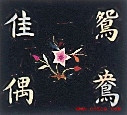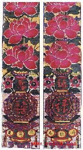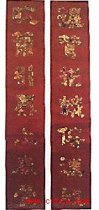 (镇江市博物馆藏)上联「握管描蛾传汉殿」,为汉代京兆尹张敞为妇画眉而传于皇帝的典故。下联「吹箫引凤上秦台」,为萧史与秦穆公女弄玉结鸾凰后跨凤成仙的典故。字体为隶书,用作新婚贺福。