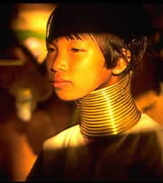 泰国以著名的风景名胜和奇特的民族风俗而闻名于世,珂伦族的“长颈女”恐怕是泰国独一无二的。他们认为长颈姑娘是最美的,从小便以铜环缠绕女子脖颈,为此当地人把珂伦族俗称为“长颈族”,他们生长在泰国北部夜丰颂府的珂伦族村寨里。 据说,要做长颈女是要经过挑选的,只有出生在某个特定时辰的女孩才可以