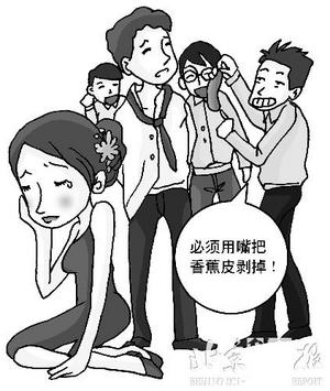 制图/铅色工坊 折磨肉体、模仿*、折腾伴郎 步入八月,七夕的话题让很多商家笑逐颜开。因为今年“闰七月”,将有两个“传统情人节”———七夕供情人们缠绵。甚至于云南丽江借七夕到来之际,在七月底到八月举办声势浩大的情人节庆祝活动,为时足有一个月,堪称大手笔。当然也有不少情侣选择这一良辰办喜事。据记者在北京(北京新闻,北京说吧)几大婚纱影楼所做的调查,预约拍照都有增无减。 但接下来的婚礼上,闹洞房却很让新人们挠头,因为很多朋友都想趁着新婚之际好好捉弄一下新人呢。以至于有媒体多次报道闹房造成新人反目的事件。但是如果取消这个环节,还真让人觉得空落落的,“婚礼味不足”。 这究竟是怎样一种古老的仪式呢?现代社会中它是否还有存在的价值?带着这个疑问,记者目击