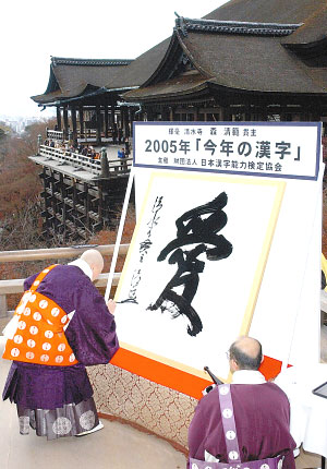清水寺主持书写日本2005年度汉字“爱” 9月6日,日本天皇家族41年以来第一次添丁。孩子出生以后,老百姓家的第一件事情就是忙着起名字了。在日本,普通新生儿起名字是在出生两周之内,而皇室则是在出生的第7天。据说这个习俗和古代新生儿在出生后夭折率太高有关。在日本的名字中,中文字占了很大比例,为了让名字有个好的含义,家长都深思熟虑,花上两个星期也一点儿不过分。 起名要“过五关斩六将” 普通日本人出生的时候起名,有着繁琐的规则。传统上,日本人的名字普遍使用汉字,只是在二战之后开始有一些比较新潮的人用欧美常用英文名的日语发音作自己的名。 用汉字起名,在日本可要“过五关斩六将”。所谓五关,指的是孩子的名字必须符合“五格”,即总格——昭示一生的吉利;人格——反映期待的性格才能,并要求可以克制凶运;地格——符合对健康、平安等的追求;天格—