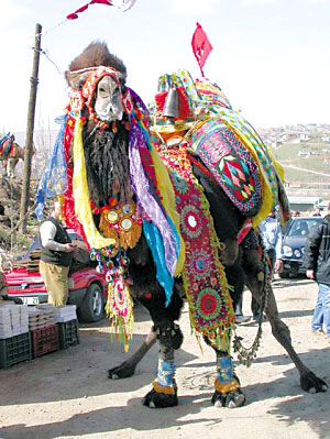 赛前着盛装的骆驼 斗骆驼是土耳其南部地中海和爱琴海沿岸各省份流行的一种冬季传统娱乐项目,它不像西班牙斗牛那样血腥刺激和令人震撼,但很独特、很有趣。 参赛骆驼是同一品种 据说斗骆驼比赛是在约200年前兴起的。一些商队间和游牧人家之间常让骆驼彼此角斗以争高低。土耳其的骆驼角斗是在一种名为“蒂吕”的双峰雄驼之间进行的。这种骆驼是由“约兹”种的单峰雌驼与“布胡尔”种的双峰雄驼交配培育而来的格斗驼。所有参加角斗的骆驼都须来自格斗驼种群。 角斗一般安排在蒂吕开始发情的冬季,也就是12月至来年的3月之间。每只参加角斗的骆驼都有一个名字。人们往往会把电视剧中所喜爱的英雄人物的大名赐予它们。参赛骆驼的名字写在驼鞍后面一块色彩绚丽的帆布上,名字下一定会写着“好运常在”。