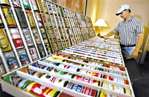 来自世界各地的啤酒罐收藏者6日齐聚美国堪萨斯城,参加那里的啤酒罐展览会,参观当地啤酒厂,并交换所藏“珍品”。 美国啤酒罐收藏俱乐部章程并不鼓励会员出售啤酒罐。会员们想增加个人收藏量,就必须在展览会上与他人交换啤酒罐。图为一名会员在展览会上认真观赏。 已是第36届 其实,今年的啤酒罐展览会已是第36届。展览会由美国啤酒罐收藏俱乐部举办,9日结束。 800余名与会者均为美国啤酒罐收藏俱乐部会员,大部分是专业收藏者。这些会员有的来自美国各州,有的从日本、德国、新西兰和南美地区远道而来。路途远的与会者动身前先通过海运把自家“宝贝”运到美国,再把一箱箱罐子搬到旅馆房间或展会现场。 会员们收集的啤酒罐形状各异、带有不同标志,有的年代久远。一些不知名品牌的啤酒罐也在他们的收藏之列。会员们各