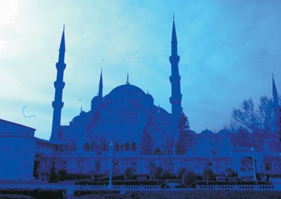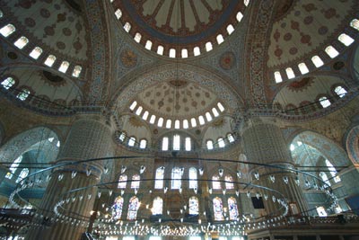 其实蓝色清真寺最具审美价值的既不是它的尖顶,也不是里面的磁砖,而是那些穹顶上那上百扇色彩绚丽的窗户。光线透过这些窗户变幻着奇异的色彩,与清真寺内空旷深远的构架和安详悠然的气氛结合在一起,让人仿佛置身在一个虚幻的空间。