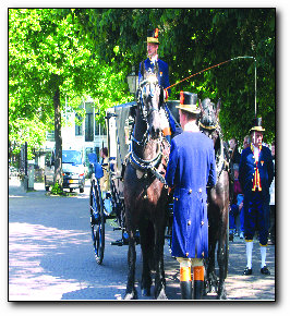 路过荷兰女王办公的地方,一幢U字型的小院。正好碰上女王接见新任大使,院子里仪仗队、军乐团整装待命,几个警察站在马路上维持秩序。我们当然扎闹猛加入围观人群,一会儿,像演戏一般,一队骑警威风凛凛开路,后面两驾豪华马车,马夫盛装打扮。锣鼓军乐中,完成觐见的两个大使跳上皇家马车,隆重地驶回使馆。