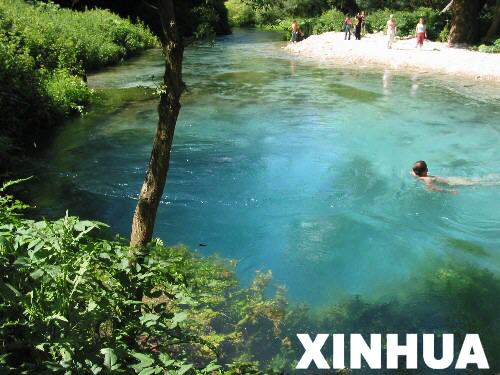 一名游人在阿尔巴尼亚南部的“蓝眼睛”风景区内游泳(摄于5月22日)。“蓝眼睛”风景区位于阿南部德尔维纳地区的丛山密林之中,是阿国内著名的旅游胜地。整个风景区古树参天、鸟语花香、流水潺潺,区内的一处泉眼常年清泉不断,在阳光的照射下呈现出宝石般的蓝色。