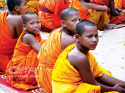 这已是第二天上午的行程了。站在主殿的台阶回望天界桥、大广场和中央大道,到处是游客、僧侣。僧侣是吴哥最靓丽的风景,他们裹着的金-、明-的僧袍,捡回了被吴哥遗弃掉的色彩。吴哥只有一种色彩:那是石头的颜色;吴哥的僧侣也只有一种色彩:那是太阳的颜色。所以吴哥的石头是沧桑的,吴哥的僧侣却是欢快的,他们平日住在景点周围的寺庙里,总是结伴到景点找游客交谈,练习英文。