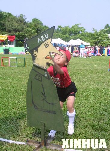 这张摄于2005年6月1日的照片显示,一名朝鲜儿童在平壤的公园里玩“刺杀”美国大兵的游戏。