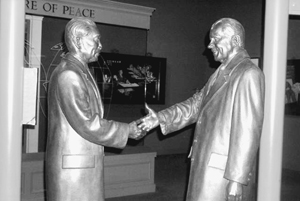 对于这位前总统在国内的-生命,人们有这样或那样的议论,但有一点是美国人所公认的。在纪念他的那块黑色墓碑上雕刻着这样一句话:“历史所能赋予的最高荣誉是和平缔造者”。这或许是美国人对这位前总统的盖棺定论吧。展览馆里的“国际事务”厅更多地体现了这一点。