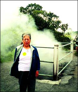 这个岛上更是风景宜人。我们这个车上有20人左右。来自四面八方游客都是亚洲人,一路上导游不停地介绍岛上的风光以及当地的风土人情,每到一个景点导游给订好时间大家玩玩,互相照照相,然后再上车继续下一个景点。总之,路上尽情享受着大自然的美景和稀奇古怪的热带的植物。我们还去当地的集贸市场,买了当地的水果如手指粗的小香蕉以及木瓜、红毛丹等等。还观赏了悬崖峡谷直上直下的瀑布,实在是太美了。饭后我们继续出发,去看冒着蒸气的火山口,热气逼人,大家都照了相,还去摘了野果子和杨桃,野果子真是香甜可口别有一番滋味。然后去了真正的基里维亚火山所在地,先看了录像并听介绍。画面上红色的岩浆,就像铁水一样向外喷射,实在是壮观极了。