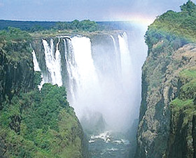 非洲最大的瀑布,名维多利亚瀑布。位于赞比西河上、中游交界处,赞比亚与津巴布韦之间,海拔87米。河流在此形成“之”字形峡谷瀑布带,绵延97公里、宽24-100米。在马兰巴和卡搭拉克特岛之间是主瀑布,落差122米、宽约1800米,被岩岛分隔成5个瀑布泻入宽仅400米的深潭,水雾如云,声鸣如雷,雾汽和声浪远达10公里以外。当地居民称莫西奥图尼亚,意为“雷鸣之烟”,形容瀑布之雄壮。瀑布年平均流量1400立方米/秒,雨季可达到5000立方米/秒,水力储量巨大。