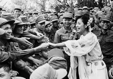 邓丽君(右)赴军中演唱,与官兵握手致意。(图1)