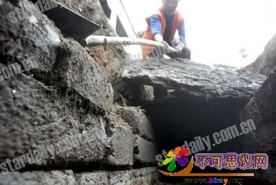 昨天记者赶到现场时,被挖出的城砖已被重新埋入地下。工人小张称,当时,他们在距离地面1米深的地方挖出一些长宽约1.5米的青石板,石板下有一条用城砖砌成的沟,宽约60厘米。有些城砖已经破裂,沟内有污水流过。当时大家都觉得只是一些破砖头。