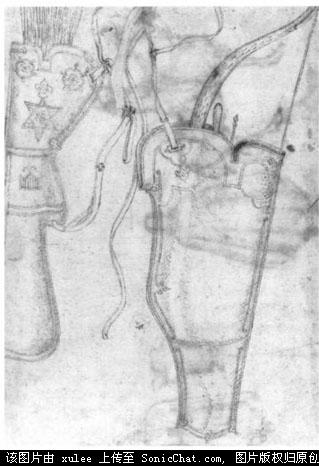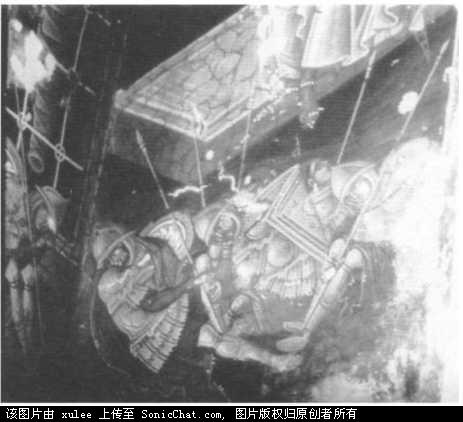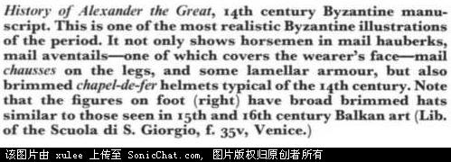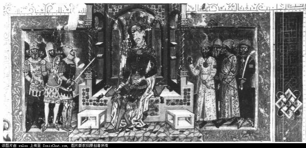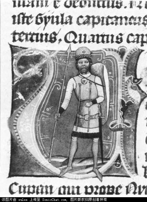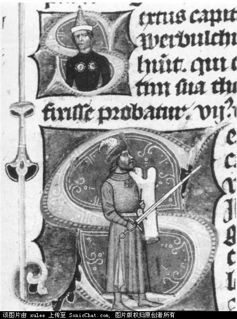 这两张画也是来自那本年表。两个战士都是14世纪的,但是却风格不同。上边的像是亚洲人,但却用欧式的盾牌和长矛。下图中的骑士的腿上的盔甲确有欧洲的风格。