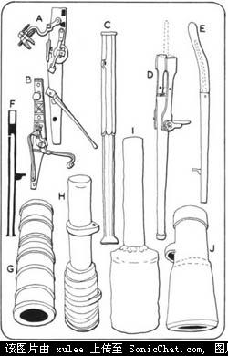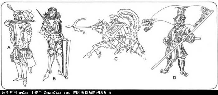 A:木刻画中的匈牙利十字弓手,15世纪;B:杭雅迪.雅诺斯在他死后不久,人们的木刻画 C:在一个马具皮带上刻的图片,一个轻骑兵,16世纪早期。D:16世纪早期,农民起义军
