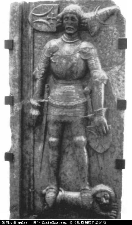 1430年,大臣Stibor的石像(棺上的)。这个详细的浮雕表明这个匈牙利贵族有一身意大利风格的盔甲。如果不是他的不寻常的纹章(头的左侧盾型纹章),一定会将他作为一个15世纪的意大利骑士。(布达佩斯历史博物馆,布达佩斯)