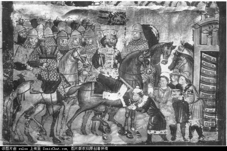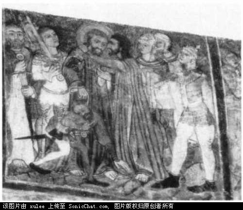 壁画,“背叛者”公元1400-1420年,特兰西瓦尼亚。尽管被破坏过,但是又修复了。这张画中的士兵们区别很大。左边的是西方人,而右边的却是巴尔干人。