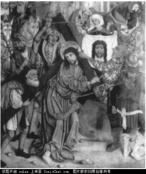 “基督受难之路”,公元1480-1490,绘于祭坛之上。尽管这幅画的风格有日耳曼的,但是画家本人却对于当地罗马尼亚人,游牧人以及奥托曼的风俗有着直接的了解。画中的士兵和那些日耳曼的以及波希米亚的有很大的区别 。