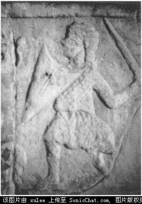 和怪物战斗的武士。拜占庭浮雕,13-14世纪。在年表中说这是创作于10--11世纪,但是他的盾牌显示了不是这个时期的。他还穿了一件锁子甲。还有一件类似于在中东伊斯兰画中出现的短裙,使用了一支长剑。