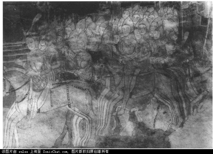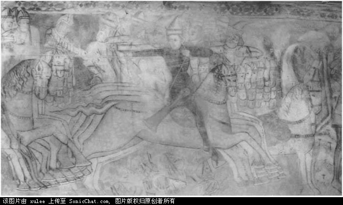 ”逃跑的库曼人“,1370年斯洛伐克的壁画。此画的作者对于游牧民族的武器和马具很熟悉,和正在追击的匈牙利人(左)有很大的区别。但是实际上到了14世纪晚期,库曼人已经很欧洲化了。