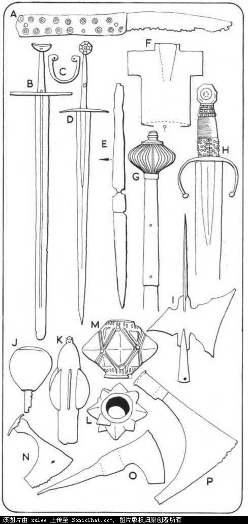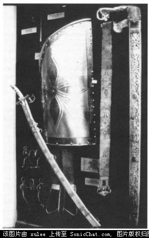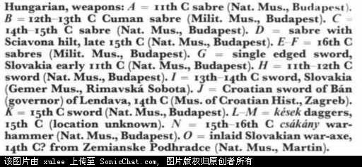 Mohacs地区的轻骑兵装备。尽管更加像仪式上用的而不是战场上用的,这些装饰性的武器有马刀,不规则四边形的盾牌,马镫,以及马具。16世纪早期