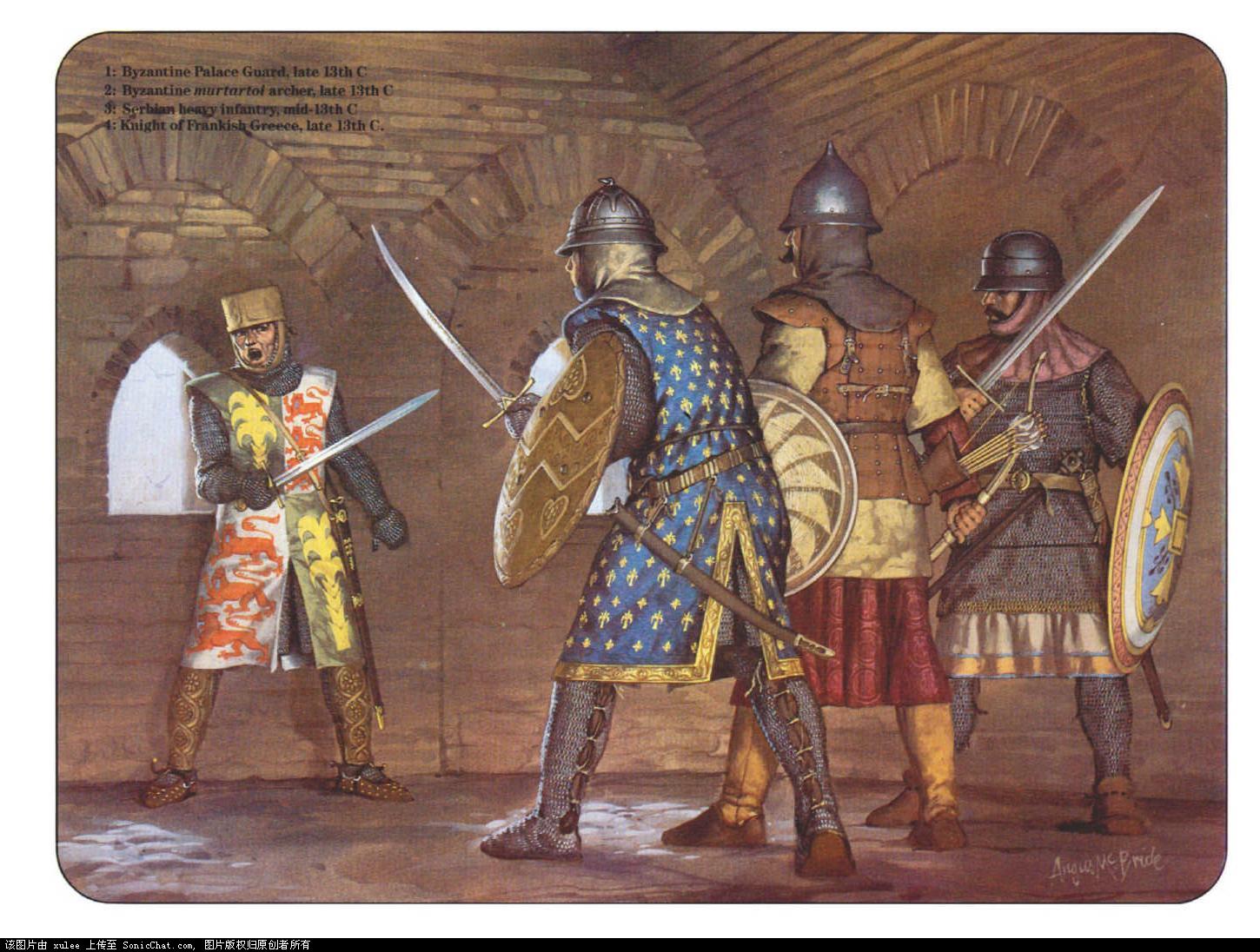 从左至右:法兰克希腊的骑士,13世纪晚期;拜占庭宫廷卫兵,13世纪晚期;塞尔维亚重装步兵,13世纪中期;拜占庭弓箭手,13世纪晚期。
