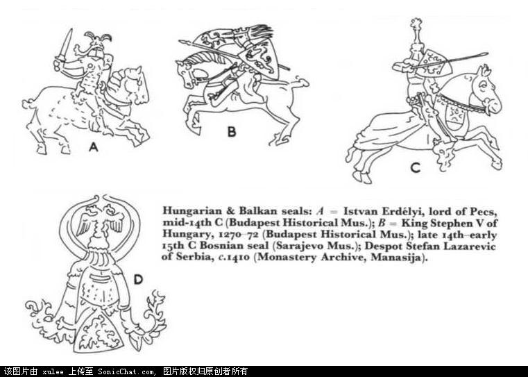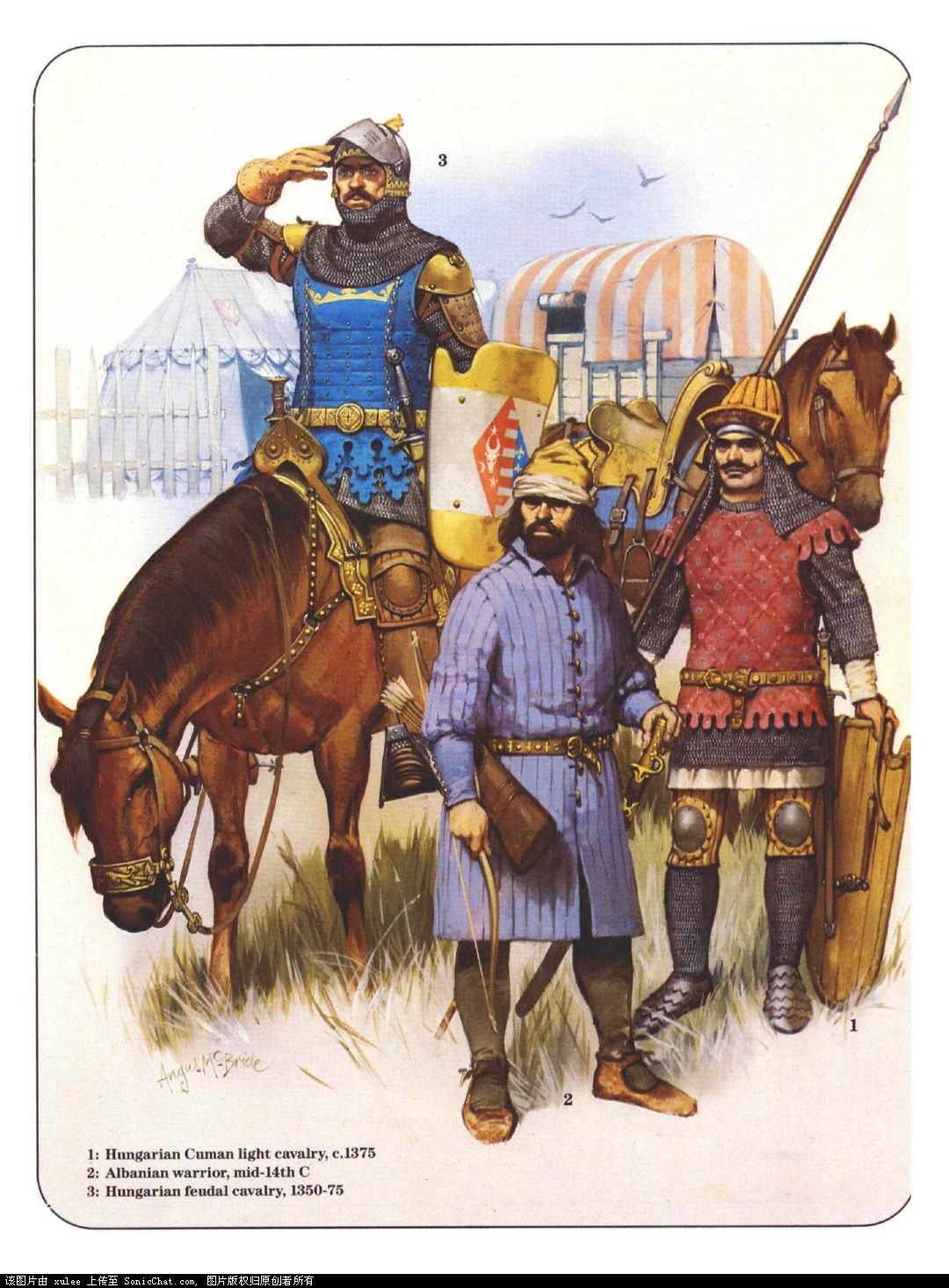 左边的是匈牙利封建骑士,1350-1375年;中间的是阿尔巴尼亚武士,14世纪中期;右边的是匈牙利库曼轻骑兵,公元1375年。
