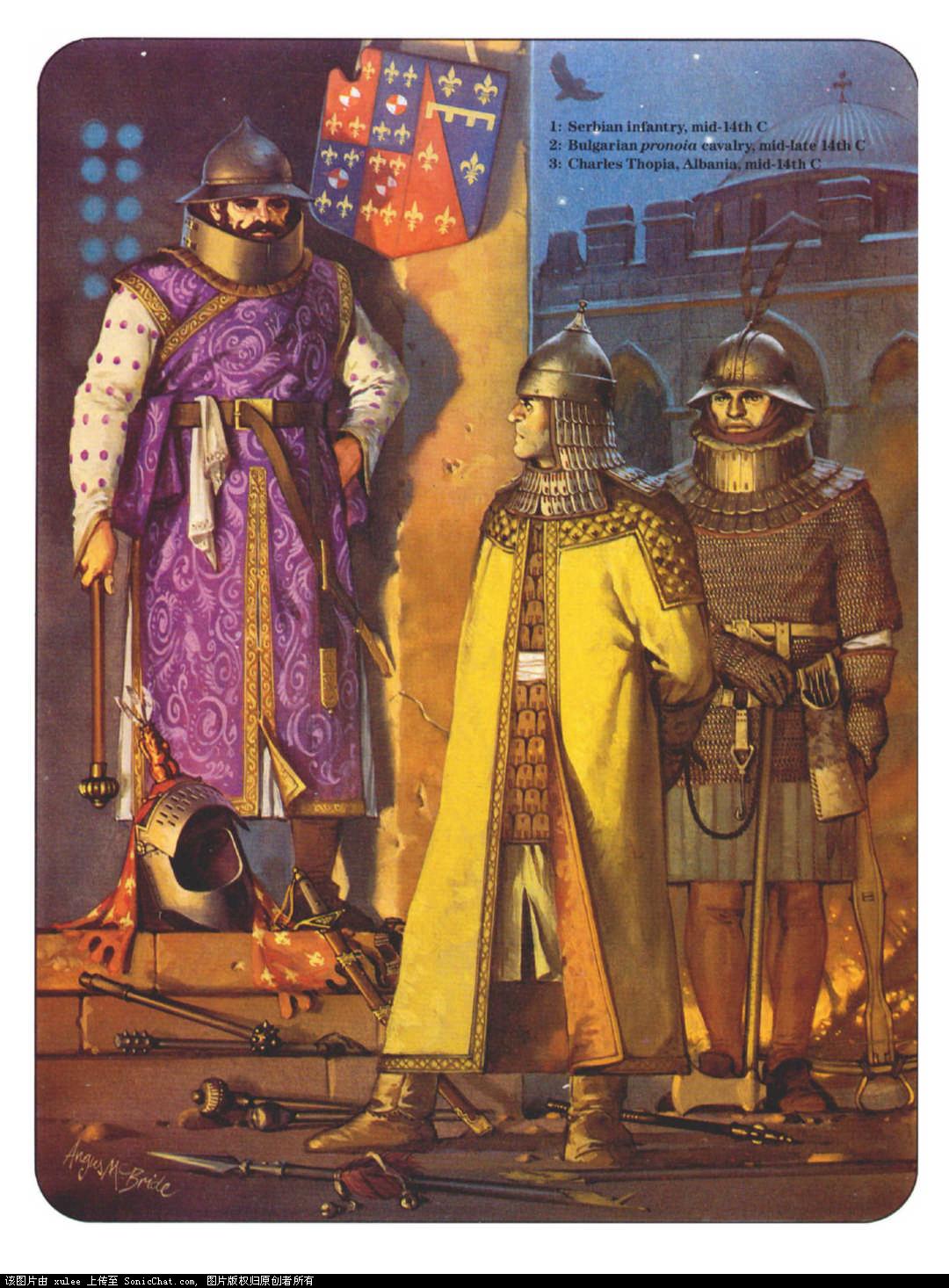 从左到右是塞尔维亚步兵,14世纪中期;查理. 托皮亚,阿尔巴尼亚人,14世纪中期;保加利亚重骑兵,14世纪中晚期。