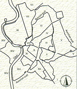 共和时期罗马城有4个区,7BC奥古斯都扩大到十四个区(Region),以罗马数字命名,区长由政府官员担任。每个区又分为更小的街区(vici),只有各街区的主路才有路名和路牌,不在主路上的居民只能自己想法标出房子的位置。例如:某某神龛东边的第五栋房子;某某面包店往下两个门。