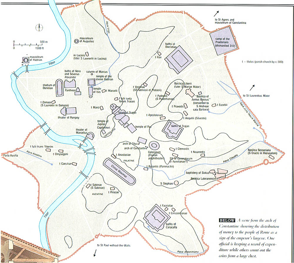 帝国后期的罗马城布局,右上角城墙边的是禁卫军营,AD312后拆除。