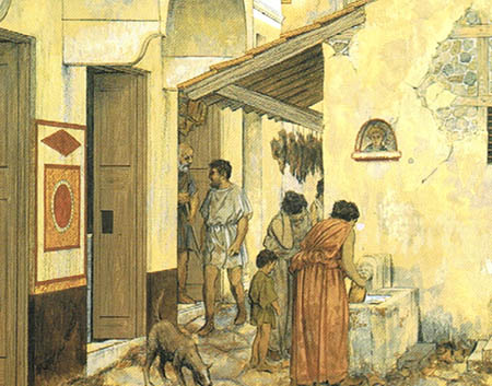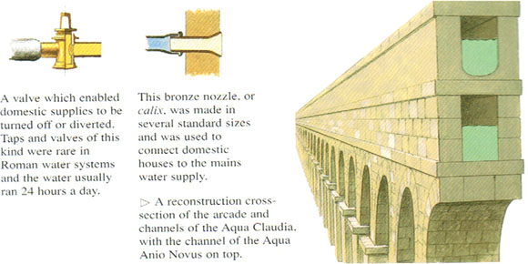 上面是供水管(罗马人的供水管都是铅制品)和下水道的截面图,分支水管直接通到住宅。但大部分的平民住宅没有这样的自来水,必须要去附近的公共喷泉提水。