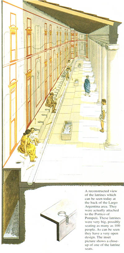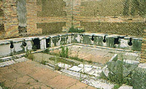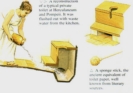下面是一个典型的私厕,用厨房的脏水冲,污水流进公共下水道或住宅的污水坑。对海格里尼姆城(Herculaneum)的发掘表明,所有的住宅,甚至位于2楼的公寓,都配有厕所。