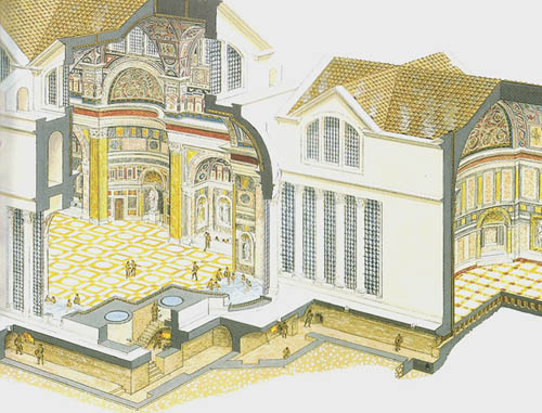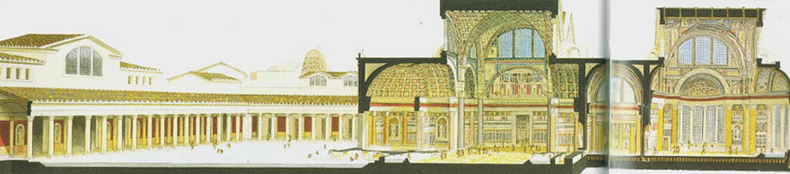 这是澡堂前半部分的剖视图,从左到右是大门、露天的冷水浴池、冷室(frigidarium)、温室(tepidarium)、热室(caldarium)。