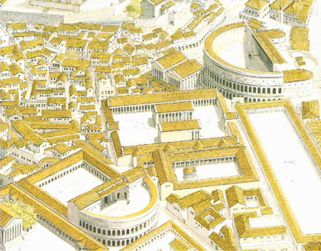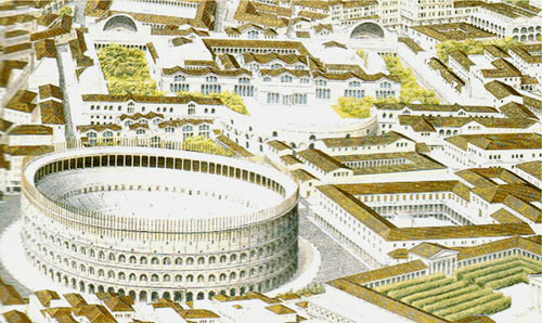 罗马人在建城之初的几百年,显然没有想到子孙们会建立起一个庞大的帝国,罗马城的人口会超过一百万。因此在建设时毫无长远计划,只是简单地由中心向外扩展。到了帝国时期,皇帝们想要好好规划一番时,已经太迟了,市区里挤满了杂乱无章的建筑,要造个规模大点的皇宫都没地方。AD64的那次大火后,才烧出了大片空地,于是尼禄的皇宫,后来的大竞技场、大澡堂都陆续建了起来。