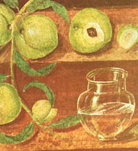 海格里尼姆城壁画上的桃子,这幅画令人感兴趣的地方倒不在桃子,而是旁边的玻璃瓶,说明当时的玻璃工艺达到了很高的水平。