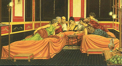那些家里有专门饭厅的罗马人和希腊人一样,是半卧着用餐的,上图就是一个小型的晚餐聚会。