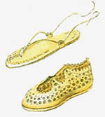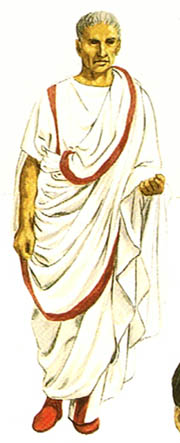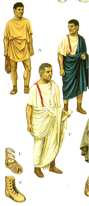 如上图A,劳动人民的外衣一般不过膝,有钱人就长的多。所有的男性公民都有权在外衣上加件外袍(toga),见上图C,但这种外袍比较笨重,有闲阶级才会穿着。高级官员和元老可以穿镶紫边的外袍。请注意上图的B和C,花边是染在tunic,而不是在toga上,说明他们有身份,但还没有达到元老的级别。E是士兵和工人穿的凉鞋(hobnailed sandal),F是靴子。
