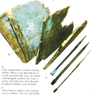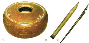 罗马人的书写工具,A 墨水盒 B 芦管笔 C 青铜笔(笔头和现代的钢笔差不多)