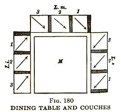 如果空间够大,则摆设如上图,中间的空地摆一张大桌子。用餐者左侧身半卧,左肘撑在榻上。左边的卧榻lectus imus 是主人的位置。