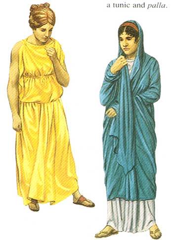 罗马妇女穿的束腰外衣(stola)很长,通常在胸部下面加系一条带子,以凸出XX,如上图左。上图右的妇女披着长围巾(palla)。除了妓女和犯了通奸罪的女人,罗马妇女不穿toga。
