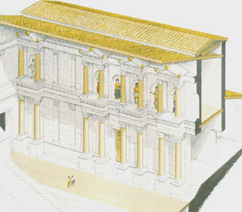 戏剧是罗马人生活中很重要的一部分,碰上公办私办的庆典都要大演几天甚至一二十天。但在共和时期,元老院禁止在罗马城修建永久剧场,认为天天看戏会使公民们颓废。所有的剧场都是临时搭建的木结构,庆典后拆除。老普林尼(Pliny the Elder)在《自然史》里描述了58BC的一个豪华临时剧场,舞台后的布景有三层,共360个柱子,第一层是铺大理石,第二层铺玻璃,第三层镀金的木板。整个剧场的装饰用了3千个雕像,可以容纳8万人。