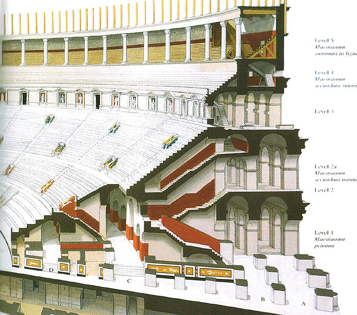 座位区分为好几层,最下层(Level 1)的是元老席,从C点进入,只要爬一小段台阶。最上层(Level 5)座位是木制的,总共得爬138级台阶。从奥古斯都时代起,所有剧院马场的坐席都划分为不同区域留给不同阶层的观众,这是奥古斯都重建社会秩序计划的一部分。最下层最靠近演出区的位置永远是留给元老和高级官员的,社会地位越低,座位越靠上,妇女的位子在最上方(神庙的童贞女可以坐在元老席)。