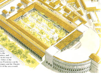 55BC庞培修建了罗马城的第一个永久剧场(上图),直径160米,27000个座位,剧场后还附带了一个大花园。为了绕过元老院的*,庞培宣称这是献给维纳斯女神的(据说这个剧场是庞培的老婆、凯撒的女儿朱莉亚提议修建的,她还亲自参与了设计。由于罗马人都认为凯撒出身的朱利乌斯家族是维纳斯的后裔,所以庞培提出了这样一个建剧院的借口)。