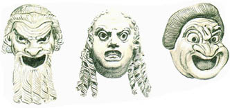 喜剧用的面具:左起,老人、年轻人和奴隶