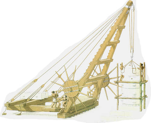 这是根据古罗马工程师Vitruvius的描述绘制的滑轮组起重机,用了两个定滑轮和一个动滑轮。有古籍宣称这种起重机是公元前3世纪阿基米德发明的。