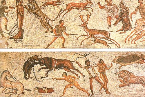 一个犯人被绑在小车上,推向一只猛兽,不少早期犯法的基督徒就是如此处决的。下面是被铁链栓在一起的熊和公牛,以确保它们不会临阵脱逃。